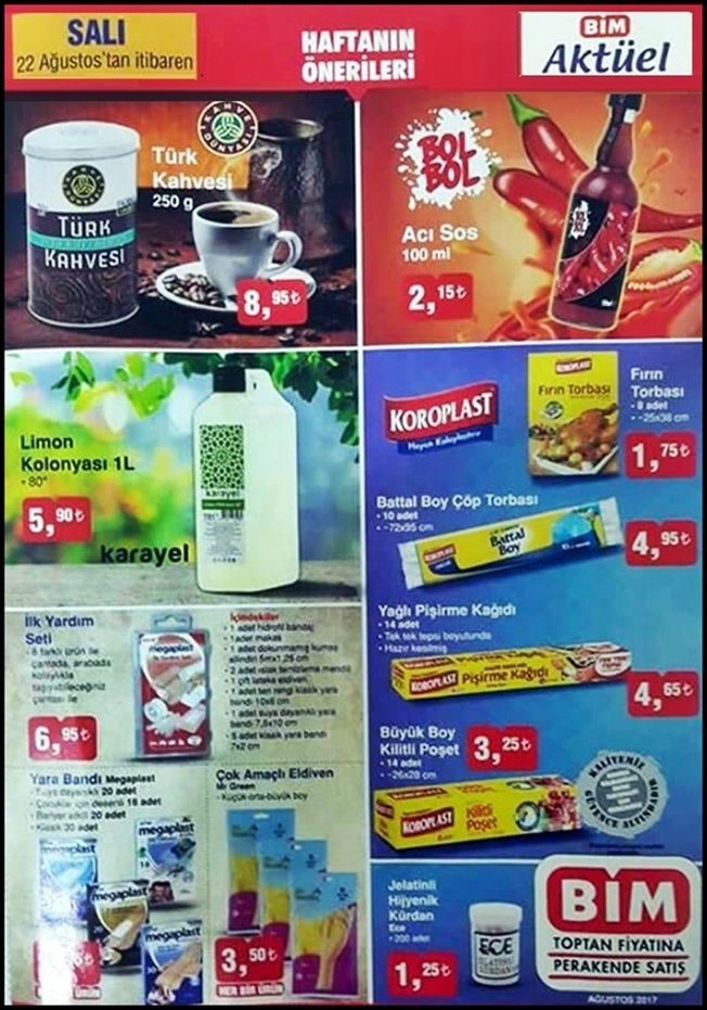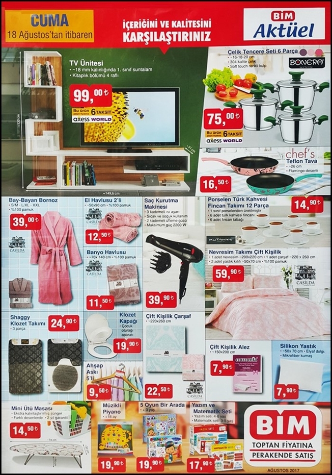 Bim 18 Ağustos 2017 tarihinde satışa sunulacak indirimli aktüel ürün kataloğu belli oldu. Birbirinden güzel ve kaliteli ürünler yeni haftada marketler zincirinde çok uygun fiyatlarla satışa sunuluyor olacak.