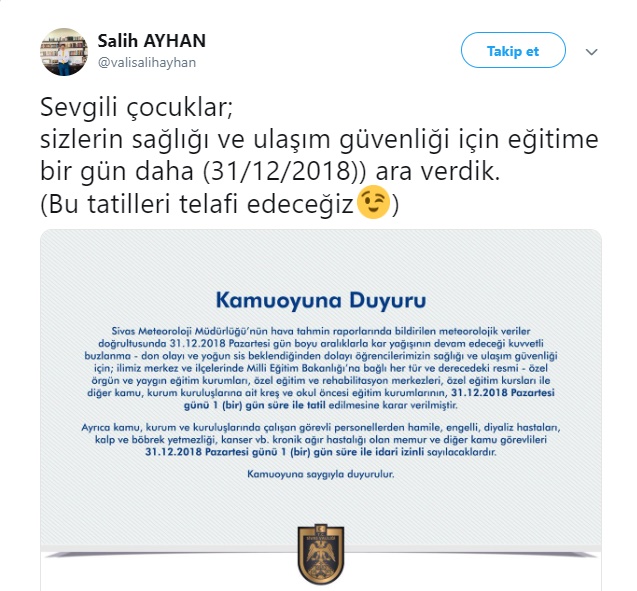 Sivas meteoroloji Müdürlüğü'nün hava tahmin raporlarının da bildirilen meteorolojik veriler doğrultusunda 31 12 2018 pazartesi gün boyu aralıklarla kar yağışının devam edeceği kuvvetli buzlanma ve don olayı ve yoğun sis beklendiğinden dolayı öğrencilerimizin sağlığı ve Ulaşım güvenliği için ilimizin Merkez ve ilçelerinde Milli Eğitim Bakanlığı'na bağlı her türlü ve derecedeki resmi özel örgün ve yetim kurumları özel eğitim ve rehabilitasyon merkezleri özel eğitim kursları ve diğer kamu kurum kuruluşlarına ait kreş ve okul öncesi eğitim kurumlarının 31 12 2018 Pazartesi günü bir gün süreyle tatil edilmesine karar verilmiştir Ayrıca Kurum ve kuruluşlarında çalışan görevli personellerinin hamile engelli ve Diyaliz hastaları kalp ve böbrek yetmezliği kanser ve bunun gibi kronik ağır hastaları olan memur ve diğer kamu görevlileri 31 12 2018 Pazartesi günü bir gün süreyle idari izinli sayılacaktır.