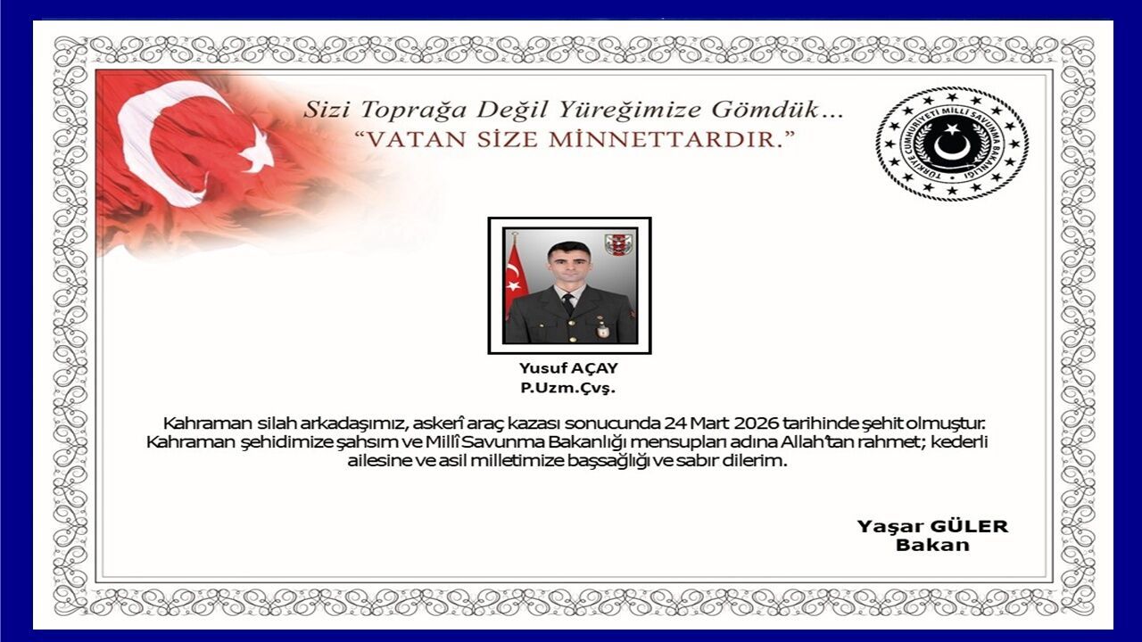“24 Mart 2026 tarihinde Ağrı Doğubayazıt'ta meydana gelen askeri araç kazasında, kahraman silah arkadaşımız Piyade Uzman Çavuş Yusuf Açay şehit olmuştur. Bizleri derin bir acı ve üzüntüye boğan bu olayda hayatını kaybeden aziz şehidimize Allah'tan rahmet, kederli ailesine, Türk Silahlı Kuvvetleri ile asil milletimize başsağlığı ve sabır dileriz.”