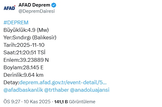Balıkesir Sındırgı merkezli 4.9 büyüklüğünde bir deprem meydana geldi. Deprem İzmir, İstanbul, Bursa, Çanakkale olmak üzere birçok şehirde hissedildi.