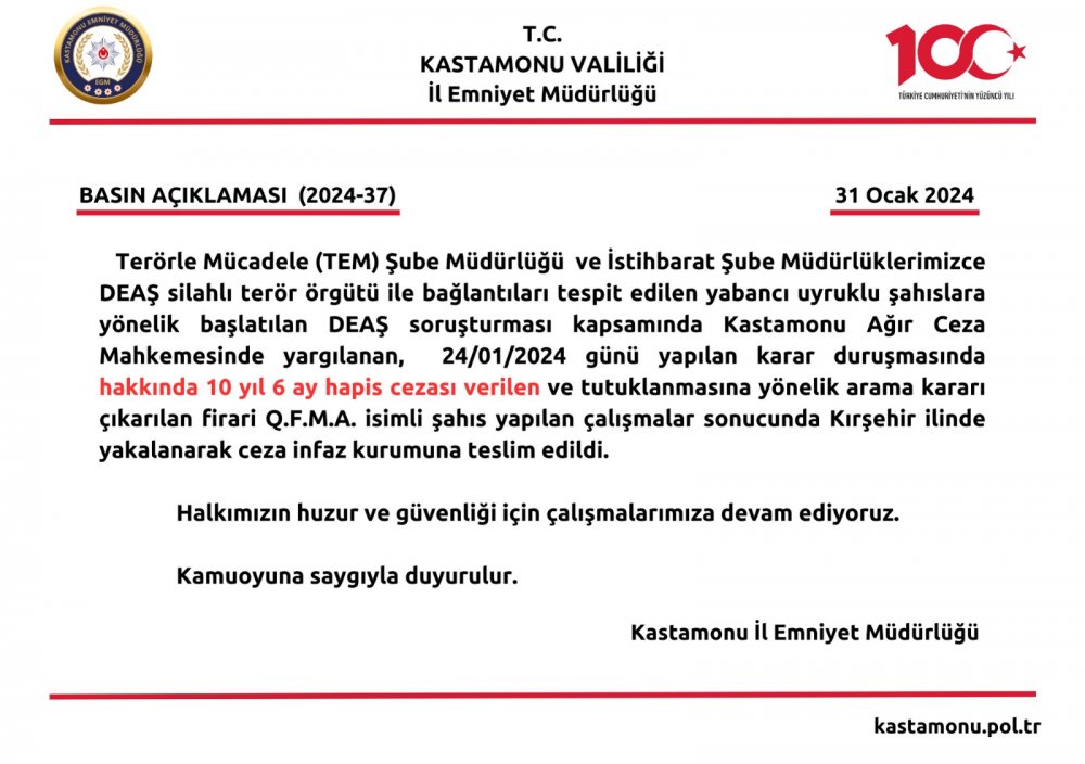 Kastamonu İl Emniyet Müdürlüğü Terörle Mücadele (TEM) Şube Müdürlüğü ve İstihbarat Şube Müdürlüklerince DEAŞ silahlı terör örgütü ile bağlantıları tespit edilen yabancı uyruklu şahıslara yönelik yaptığı çalışmalarda Kastamonu Ağır Ceza Mahkemesince 'DEAŞ silahlı terör örgütüne üye' olma suçundan 10 yıl 6 ay hapis cezası bulunan firari şahıs Kırşehir'de yakaladı.