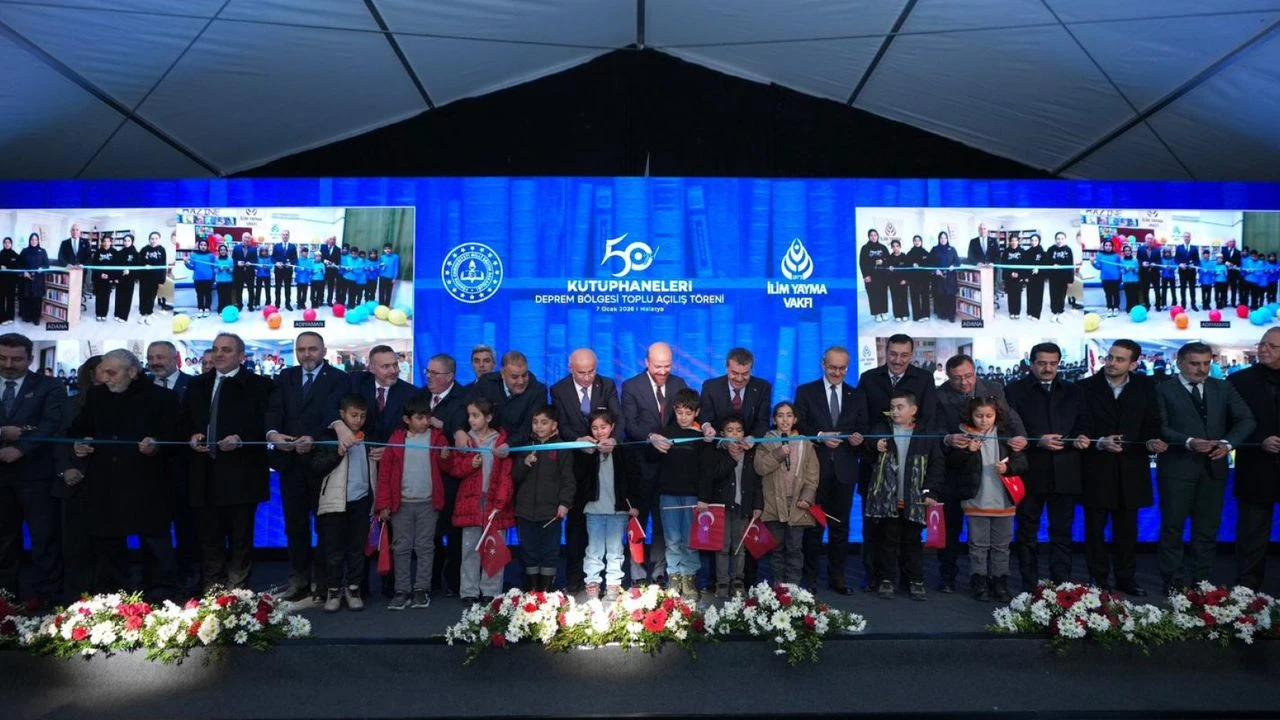 Konuşmaların ardından deprem bölgesindeki illere çevrim içi bağlanılarak yapılan 50. yıl kütüphanelerinin açılış kurdelesi kesildi.