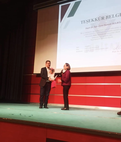 Çolakoğlu Mesleki ve Teknik Anadolu Lisesi Okul Müdürü Aycan Çamlıbel, Dr. Öğr. Üyesi Bahadır Bülbül’e özellikle okul adına yaptıkları başvuruyu ve daveti kabul ettiğinden dolayı onur duyduklarını belirterek teşekkür belgesi takdim etti.