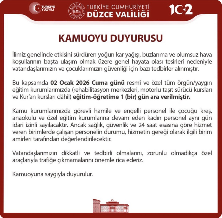 Valilik, sosyal medya üzerinden paylaştığı samimi mesajla eğitim öğretime bir gün süreyle ara verildiğini duyurdu.