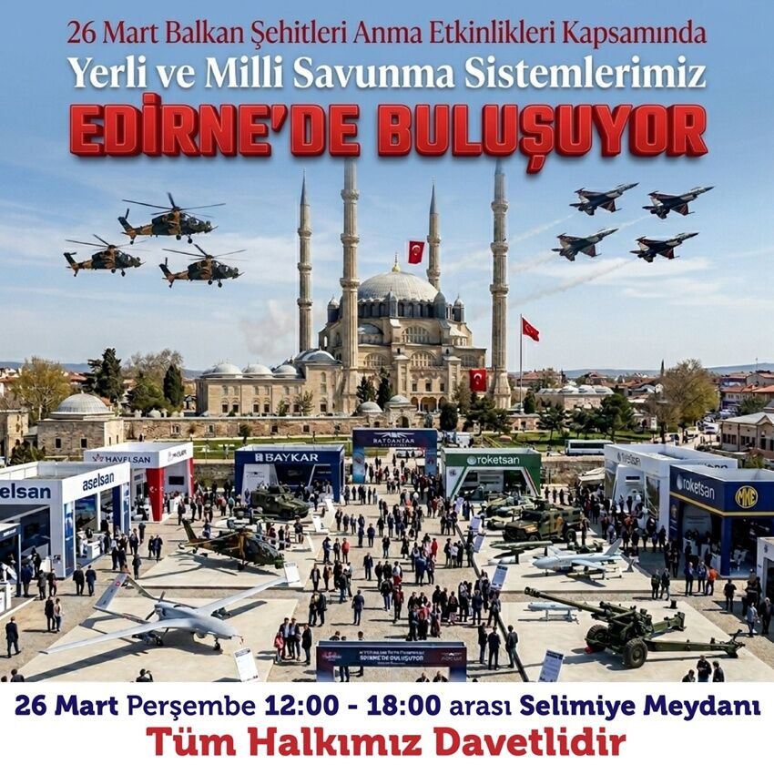 Edirne’de 26 Mart Balkan Şehitlerini Anma Günü kapsamında düzenlenecek etkinliklerle, yerli ve milli savunma sistemleri vatandaşların ziyaretine açılacak. Milli Savunma Bakanlığı ve Edirne Valiliği öncülüğünde gerçekleştirilecek program, Selimiye Meydanı’nda yoğun katılımla yapılacak.