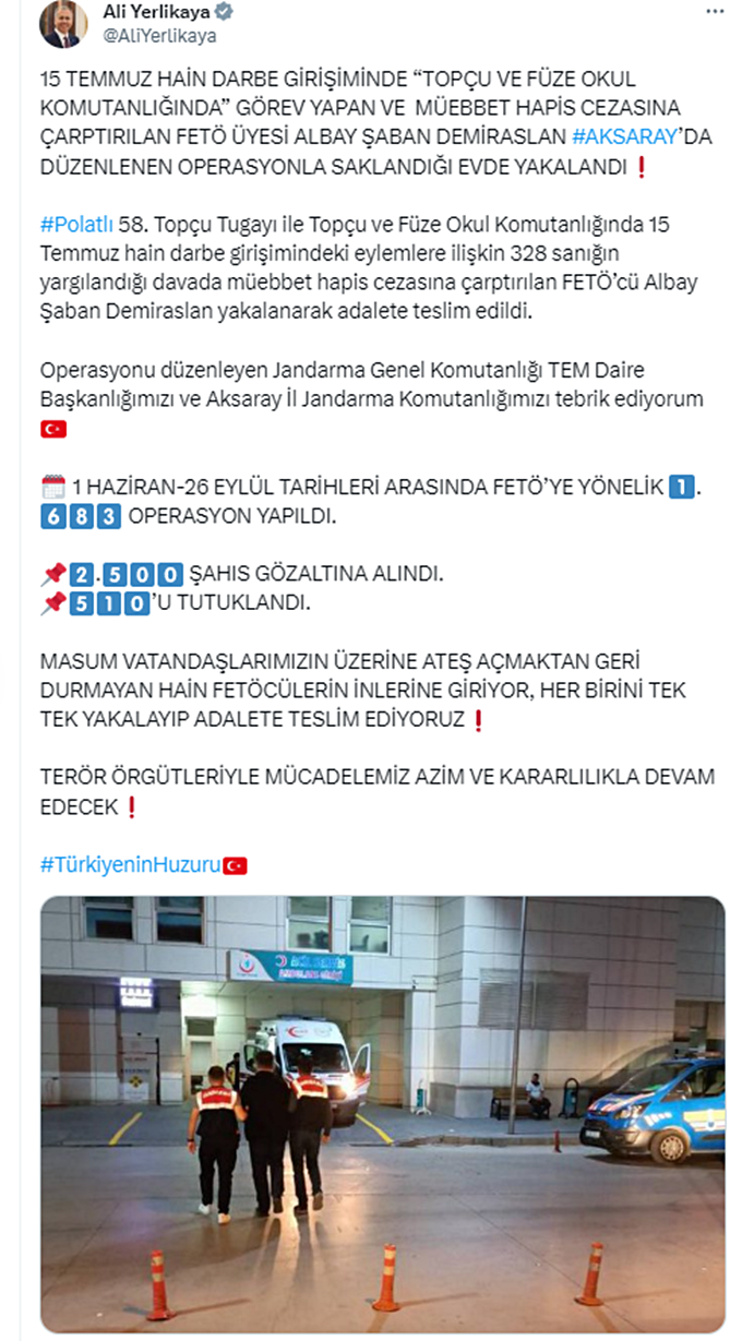 İçişleri Bakanı Ali Yerlikaya sosyal medya hesabından yaptığı açıklamada, "Polatlı 58'inci Topçu Tugayı ile Topçu ve Füze Okul Komutanlığında 15 Temmuz hain darbe girişimindeki eylemlere ilişkin 328 sanığın yargılandığı davada müebbet hapis cezasına çarptırılan FETÖ'cü Albay Şaban Demiraslan yakalanarak adalete teslim edildi. Operasyonu düzenleyen Jandarma Genel Komutanlığı TEM Daire Başkanlığımızı ve Aksaray İl Jandarma Komutanlığımızı tebrik ediyorum" dedi. "1 Haziran-26 Eylül tarihleri arasında FETÖ'ye yönelik 1683 operasyon yapıldı. 2 bin 500 şahıs gözaltına alındı. 510'u tutuklandı. Masum vatandaşlarımızın üzerine ateş açmaktan geri durmayan hain FETÖ'cülerin inlerine giriyor, her birini tek tek yakalayıp adalete teslim ediyoruz. Terör örgütleriyle mücadelemiz azim ve kararlılıkla devam edecek" ifadelerini kullandı.