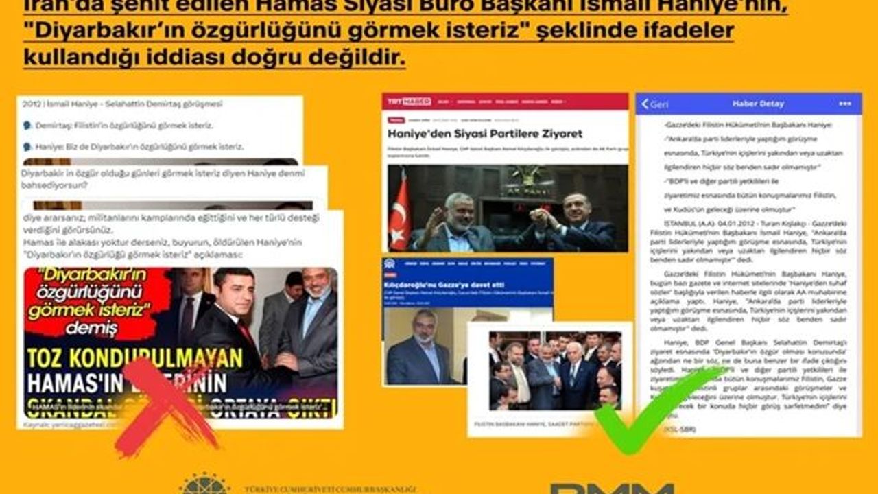 Yapılan açıklamada, "İsmail Haniye, 2012 yılında gerçekleştirdiği Türkiye ziyareti kapsamında MHP Genel Başkanı Devlet Bahçeli, dönemin parti liderleri Kemal Kılıçdaroğlu, Selahattin Demirtaş ve Mustafa Kamalak ile görüşmeler gerçekleştirmiş, AK Parti grup toplantısına katılmıştır. Haniye, Anadolu Ajansı'na yaptığı açıklamada, "Diyarbakır'ın özgürlüğünü görmek isteriz" dediği yönündeki iddiaları kesin bir dille yalanlamış, Türkiye'nin içişlerini yakından veya uzaktan ilgilendiren hiçbir konudan bahsetmediğini ve görüşmelerdeki gündemin tamamen Filistin meselesi olduğunu belirtmiştir. Bahse konu iddialar, Dezenformasyonla Mücadele Merkezimizce daha önce yalanlanmıştır. Asılsız iddialara itibar etmeyiniz" ifadeleri kullanıldı.