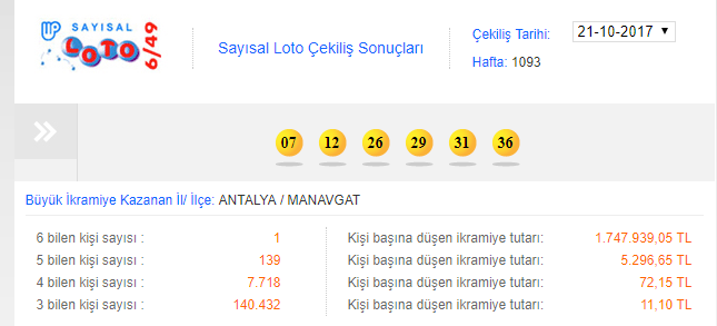 Sayısal Loto hangi ile çıktı, Sayısal Loto'da çıkan numaralar, Sayısal Loto sonuçları öğren gibi merak ettiklerinizi bu haberde derledik. 21 Ekim 2017 Sayısal Loto'da kazandıran numaralar belli oldu. Sayısal Loto'da bu hafta: 07, 12, 26, 29, 31, 36 numaraları kazandırdı. Sayısal Loto'da bu hafta 6 bilen bir kişi çıktı. Sayısal Loto talihlisi 1,747,939,05 TL ikramiyenin tek başına sahibi oldu. İşte Sayısal Loto sonuçları ve Sayısal Loto'da çıkan numaralar...