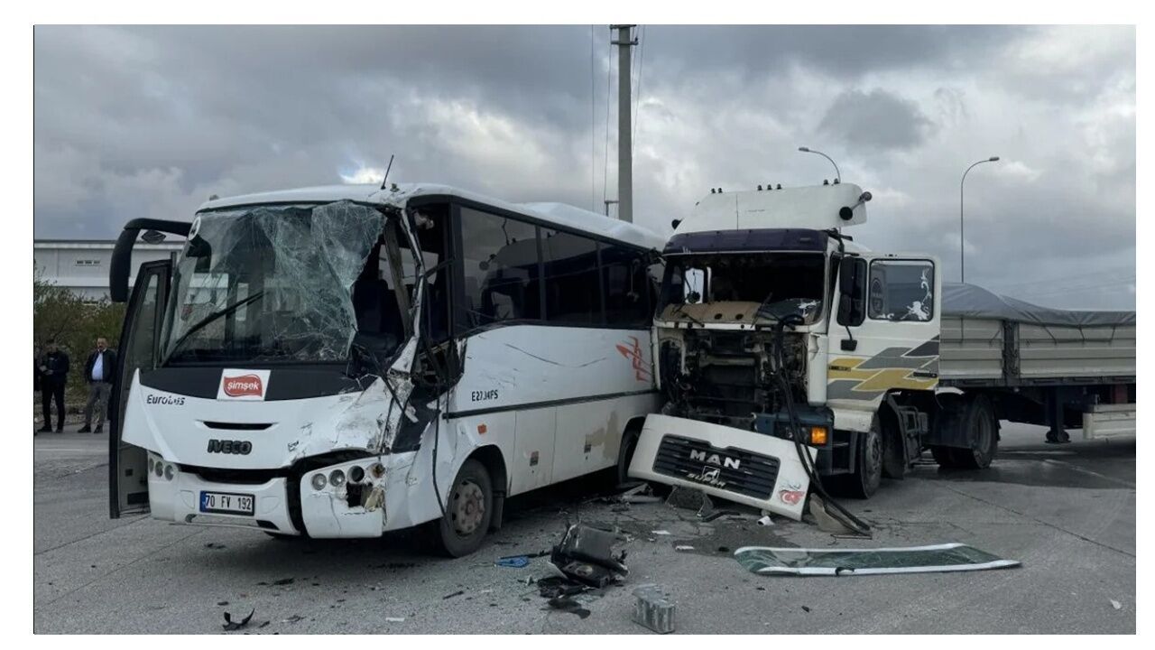 Kaza, Karaman-Ereğli kara yolundaki bir kavşakta meydana geldi. Organize Sanayi Bölgesi’ne işçi taşıyan M.Ç. idaresindeki midibüs, H.A. yönetimindeki tırla çarpıştı. Çarpışmanın etkisiyle midibüste bulunan işçiler ve sürücüler yaralandı.