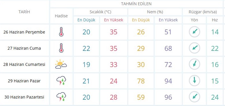 Bugün ve cumartesi günü kentte sıcaklıkların 34-35 dereceye kadar çıkması bekleniyor. Ancak pazar günü hava aniden değişecek. En düşük sıcaklık 21, en yüksek sıcaklık ise 24 derece olacak ve kent genelinde gök gürültülü sağanak yağış görülecek.