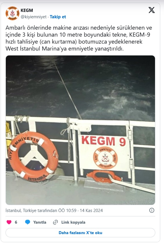 Gelen ihbar üzerine bölgeye, KEGM-9 hızlı tahlisiye (can kurtarma) botu gönderildi. Sürüklenen tekne can kurtarma botuna yedeklenerek West İstanbul Marina'ya emniyetle yanaştırıldı.