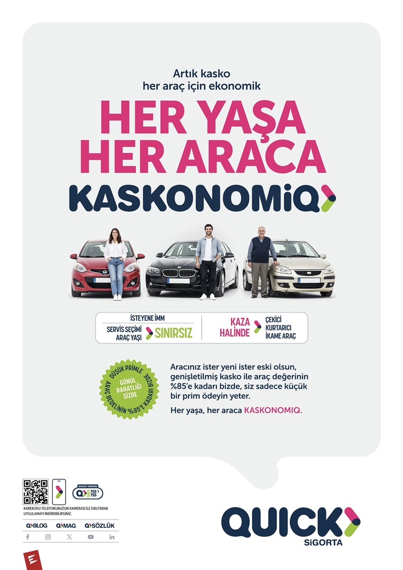 Quick Sigorta Genel Müdürü Eyüp Özsoy ise, Quick Sigorta’nın her zaman sigortacılığı daha erişilebilir, yenilikçi ve müşteri odaklı hale getirme vizyonuyla hareket ettiğini hatırlatarak, “KASKONOMIQ, bu vizyonun en güncel örneği. Artık kasko yaptırmak bir ayrıcalık değil, herkes için ulaşılabilir bir güvence. Araç yaşı veya marka değeri fark etmeksizin her sürücü kendi bütçesine uygun bir alternatif bulabiliyor. KASKONOMIQ; uygun prim, geniş teminat, esnek muafiyet oranları ve asistans desteğiyle tam bir güvenlik paketi sunuyor” diyerek “Sigorta sadece bir poliçe değil; toplumun güvenlik ağıdır ve KASKONOMIQ bu anlayışın ürünüdür” ifadelerini kullandı.
