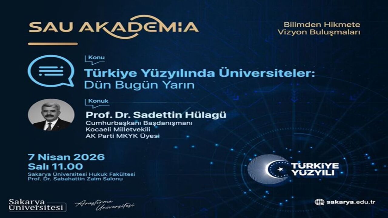 Bilimden Hikmete Vizyon Buluşmalarının ilk programında Cumhurbaşkanı Başdanışmanı, Kocaeli Milletvekili ve AK Parti MKYK Üyesi Prof. Dr. Sadettin Hülagü konuşmacı olarak yer alacak. “Türkiye Yüzyılında Üniversiteler: Dün Bugün Yarın” başlığıyla gerçekleştirilecek program, 7 Nisan 2026 Salı günü saat 11.00’de Sakarya Üniversitesi Hukuk Fakültesi Prof. Dr. Sabahattin Zaim Salonunda yapılacak. Programda, Türkiye Yüzyılı vizyonu çerçevesinde üniversitelerin geçmişten günümüze gelişimi ve gelecekte üstleneceği roller ele alınacak.
