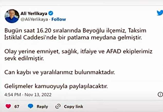 İstiklal caddesinde bombalı saldırı gerçekleşti.4 kişi yaşamını yitirdi.38 yaralı olduğu bildirildi.