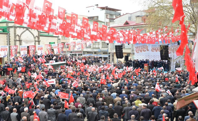 Bugün terörle mücadelenin arsından kaya gibi duran bir millet ve Hükümet var. Bugün Terörle mücadelenin arkasında duran bir Cumhurbaşkanı var. Terör fırsat kollar. Hükümetimiz güçsüz oldu, peki Avrupa sizi rahat bırakır mı? Bize dediler ki geri kabul anlaşması yapalım. Size vize serbestisi verelim dediler. Biz sözümüzü tuttuk ama onlar tutmadı. Bize terör kanununu değiştirin dediler. Güneydoğuyu PKK’ya verin, bizde size vize serbestisi verelim dediler. Biz senin vizeni de PKK’nı da başına çalarız. Türkiye’nin ayağa kalkmasını istemiyorlar. Biz füzeleri, tankları, helikopterleri, insansız hava uçağı alırken dost ve müttefiktik ama biz bunları kendimiz yapmaya başlayınca kötü olduk. PKK’yı bitirmemek için ellerindeki imkânları bize kullandırmamak için her şeyi yapıyorlar. Bu referandumda Türkiye’nin her yerine gittim. Çok sıkıntılardan geçtik. Milletimizin önüne geldik. Kılıçdaroğlu kimlerle kampanya yürütüyor. Bizim evlatlarımız operasyona çıktığı zaman dua ediyorum.
