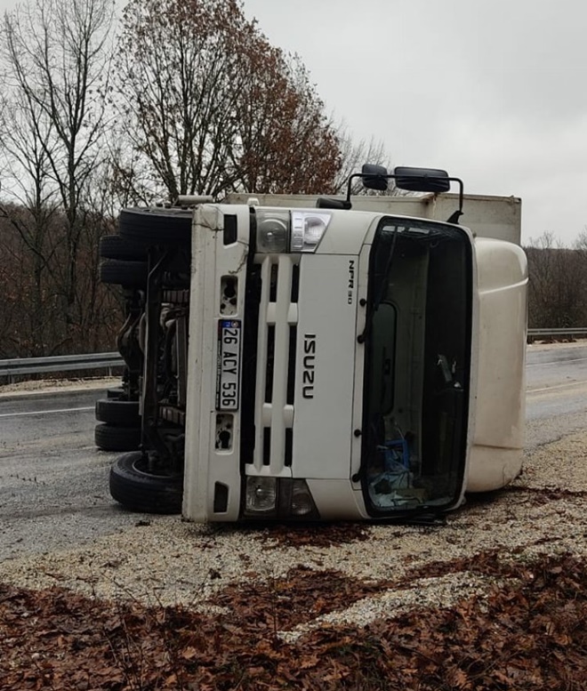 BİLECİK (İGFA) - Alınan bilgiye göre Gümüşdere Köy çıkışı İnegöl Yolu üzerinde sürücülüğünü O. A.'nın yaptığı 26 ACY 536 plakalı kamyonun virajı alamayarak yan yatması sonucu tek taraflı yaralamalı trafik kazası meydana geldi. Kazada sürücü, yolcu koltuğunda bulunan M. E adlı şahısla birlikte yaralanıdı. Olay yerine gelen 112 Acil Servis ekipleri yaralıların hayati tehlikeleri bulunmadığını belirterek, Pazaryeri Devlet Hastanesi'ne sevk etti. Yol tek taraflı olarak trafiğe açık bırakılırken, olayla ilgili tahkikat başlatıldı.
